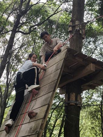 隊員們根據自己的體力挑選不同的線路,這項活動需要每個人獨立完成,活動現場不時能聽到尖叫、吶喊聲,還有隊員間相互的鼓勵和指導聲。整個運動中,也有隊員不慎滑落掛在半 空,隊員間的相互陪伴、安撫和鼓勵使得掛在半空也是另一種體驗,甚至覺得很享受。經過一個小時左右時間,所有隊員都安全完成這項匯集高空、速度、力量、毅力的戶外探險活動。